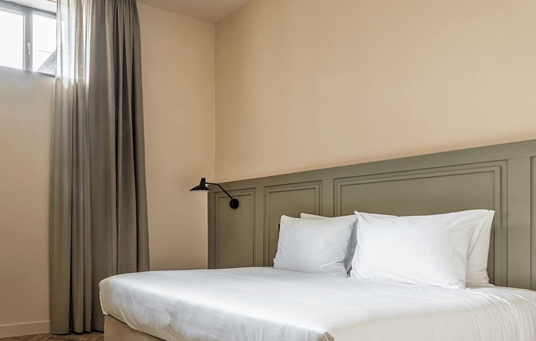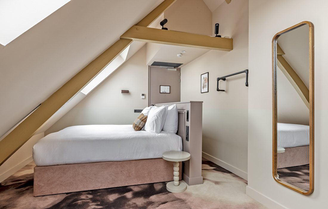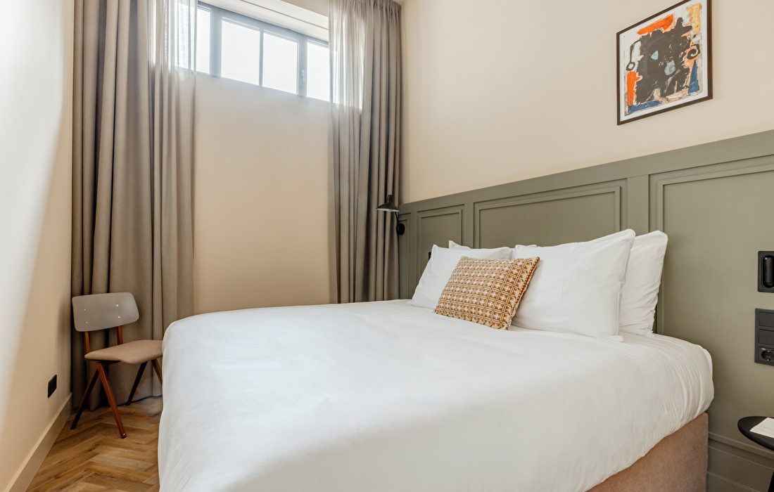 Enjoy comfort and style in this 15 to 16 m² room featuring high ceilings and a generous king-size bed below street level with natural light. The modern bathroom is equipped with a walk-in rain shower and luxurious Ajen products for a moment of relaxation.
