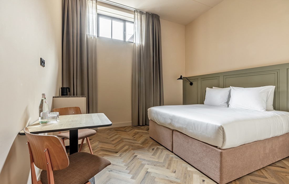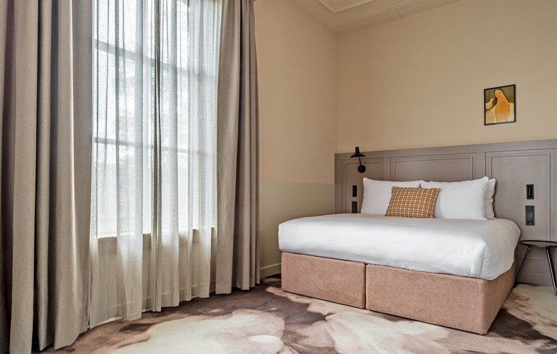 This stylish 25-square-meter room features a luxurious king-size bed. The high ceiling and large windows create a spacious atmosphere and offer views of the city center of Haarlem. In the modern walk-in rain shower, you can enjoy refined Ajen toiletries and the comfort that comes with a high-level stay.