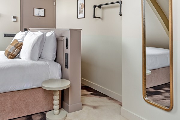 This stylish 23-square-meter room features a luxurious king-size bed, high ceilings that enhance the sense of space, and a modern walk-in rain shower with a view of the iconic dome. Enjoy refined Ajen bath products and the level of comfort that complements a high-end stay.