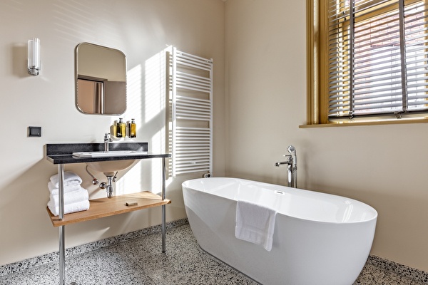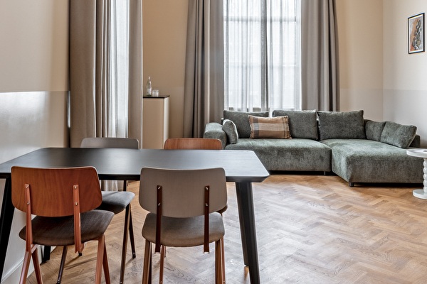 Voel je thuis in deze stijlvolle studio van 49 m² op de begane grond. Geniet van de ruime living met een comfortabele zithoek, een eettafel om te werken of ontspannen te dineren en een volledig uitgeruste kitchenette – perfect voor een langer verblijf. Het kingsize bed zorgt voor een heerlijke nachtrust, terwijl hoge plafonds en grote ramen een licht en open gevoel creëren. De moderne badkamer beschikt over een ruim bad, een inloop regendouche en luxe Ajen-producten voor een moment van pure ontspanning.